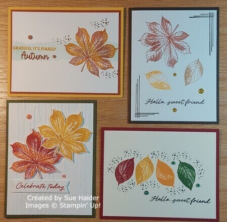 Here are four more cards made with the Artistic Leaves stamp set. This is a Two-Step Stampin’ set; it allows you to layer two or more images to create one final image with extra texture and dimension in the colors you want. Also, this is a Distinktive stamp set; it has a special texture that gives added depth and dimension in a single step, creating photo-realistic images. If you want to layer the leaves on your card, you can quickly fussy-cut them.