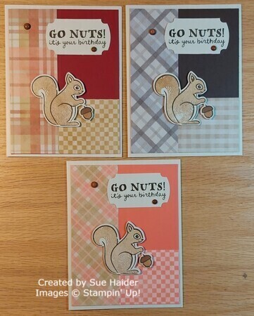 These are the cutest squirrels! Using the Timeless Plaid printed paper in several colors, I made these three cards featuring the Fluffy Squirrel stamp set and coordinating punch. The squirrel outline is stamped in Early Espresso ink and then filled in with Pecan Pie ink (stamped off). Which color combination do you like best? Shop my store at https://www.stampinup.com/?demoid=2029234